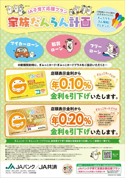 市町村役場または県子育て支援課で発行する「ぎふっこカード」をJAバンクの窓口でご提示いただいた方に、マイカーローン、教育ローンおよびフリーローンについて金利を引下げる等県内JAと一体となって子育て応援プラン(家族だんらん計画)を提供しており、18歳未満のお子様が3人以上いらっしゃる世帯・3人目のお子様を妊娠中の方がいらっしゃる世帯に発行される「ぎふっこカードプラス」をご提示いただいた方に、さらに金利優遇を行う「家族だんらん計画プラス」の提供をしています。
