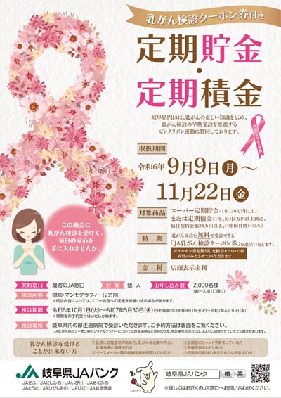 令和6年度は、10月1日のピンクリボンデーに合わせ、令和6年9月8日、10月6日に岐阜県ママさんバレーボール連盟主催試合にて、信連職員が啓発リーフレット、「乳がん検診クーポン券付き定期貯金・定期積金」のチラシ等を配布し、地域住民へ乳がんの早期発見の大切さについて啓発しました。
